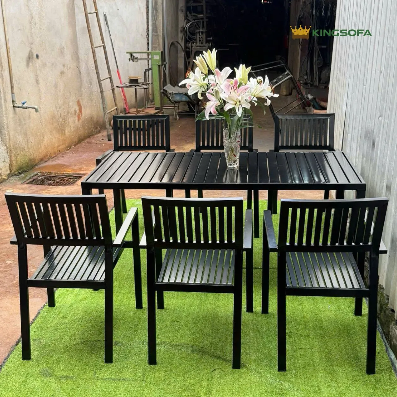 Bàn Ghế Sắt Sơn Tĩnh Điện Ngoài Trời KS-TH-0012 có thiết kế độc đáo, tinh tế và hiện đại. Cả bàn và ghế đều sử dụng thiết kế nan dọc song song đồng bộ, tạo nên một tổng thể hài hòa và hiện đại. Thiết kế này không chỉ mang tính thẩm mỹ cao mà còn cực kỳ thông thoáng, phù hợp với khí hậu ngoài trời. Toàn bộ sản phẩm được chế tác từ sắt ống và sắt tấm dày dặn, bao phủ bởi lớp sơn tĩnh điện đen mờ chuyên dụng, giúp bộ bàn ghế chống rỉ sét, chống trầy xước và giữ được vẻ ngoài mới đẹp sau nhiều năm sử dụng dưới nắng mưa.