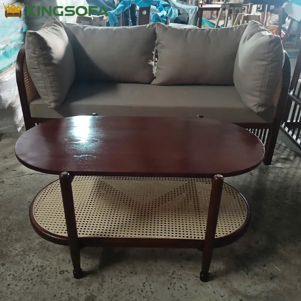 Bàn được thiết kế hai tầng, tầng trên là mặt gỗ, bề mặt của bàn được chà nhẵn bóng, mịn màng, sơn một lớp bóng giữ được vẻ tự nhiên nhưng vẫn bảo vệ khỏi trầy xước và ẩm mộc. Bạn cũng có thể lựa chọn tầng trên là mặt kính cường lực 5 ly, còn tầng dưới là phần đan mây tinh xảo, có màu sắc tự nhiên, tạo ra một lớp không gian lưu trữ thứ hai vừa mang tính thẩm mỹ vừa tiện lợi cho việc để đồ trang trí hoặc sách báo.